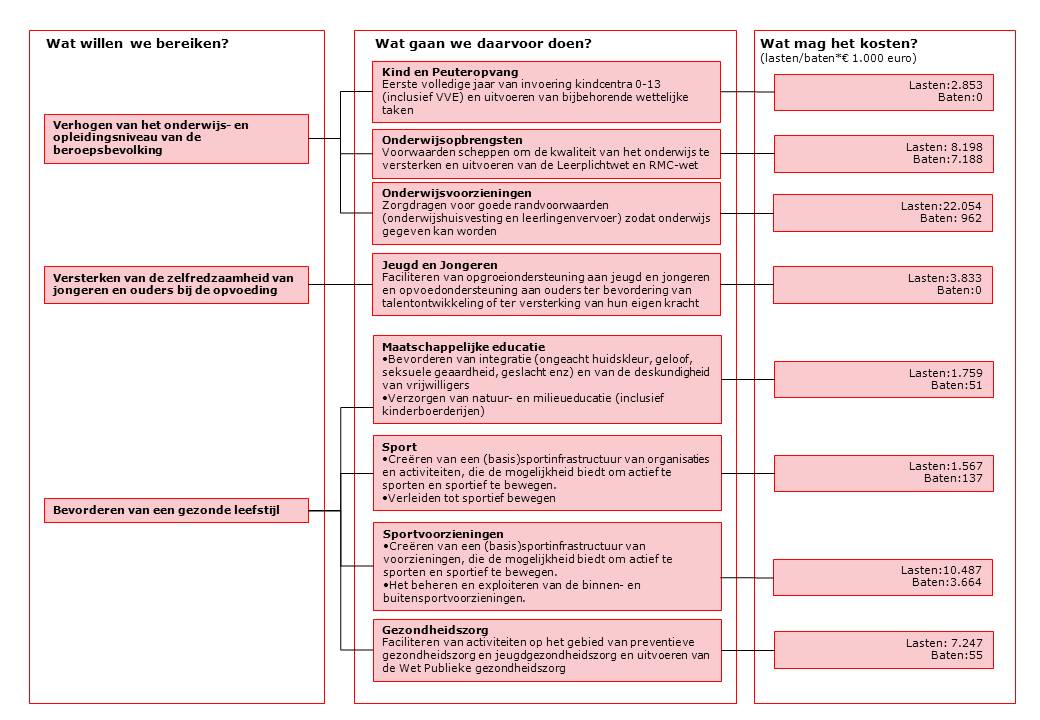 Vanaf 2015 is de doeluitkering Onderwijsachterstandenbeleid van 4,1 miljoen euro niet meer in de begroting opgenomen aangezien deze is toegekend voor de periode 2011-2014. Daarnaast is vanaf 2016 de doeluitkering Bestuursafspraken VVE (Voor- en Vroegschoolse Educatie) van 2 miljoen euro niet meer in de begroting opgenomen aangezien deze is toegekend voor de periode 2011-2015. Voorgesteld wordt om met ingang van 2015 structureel 200.000 euro te bezuinigen op Onderwijsbegeleidingsmiddelen. Daarnaast wordt structureel 100.000 euro bezuinigd op leerplicht door een reductie van de werkzaamheden.