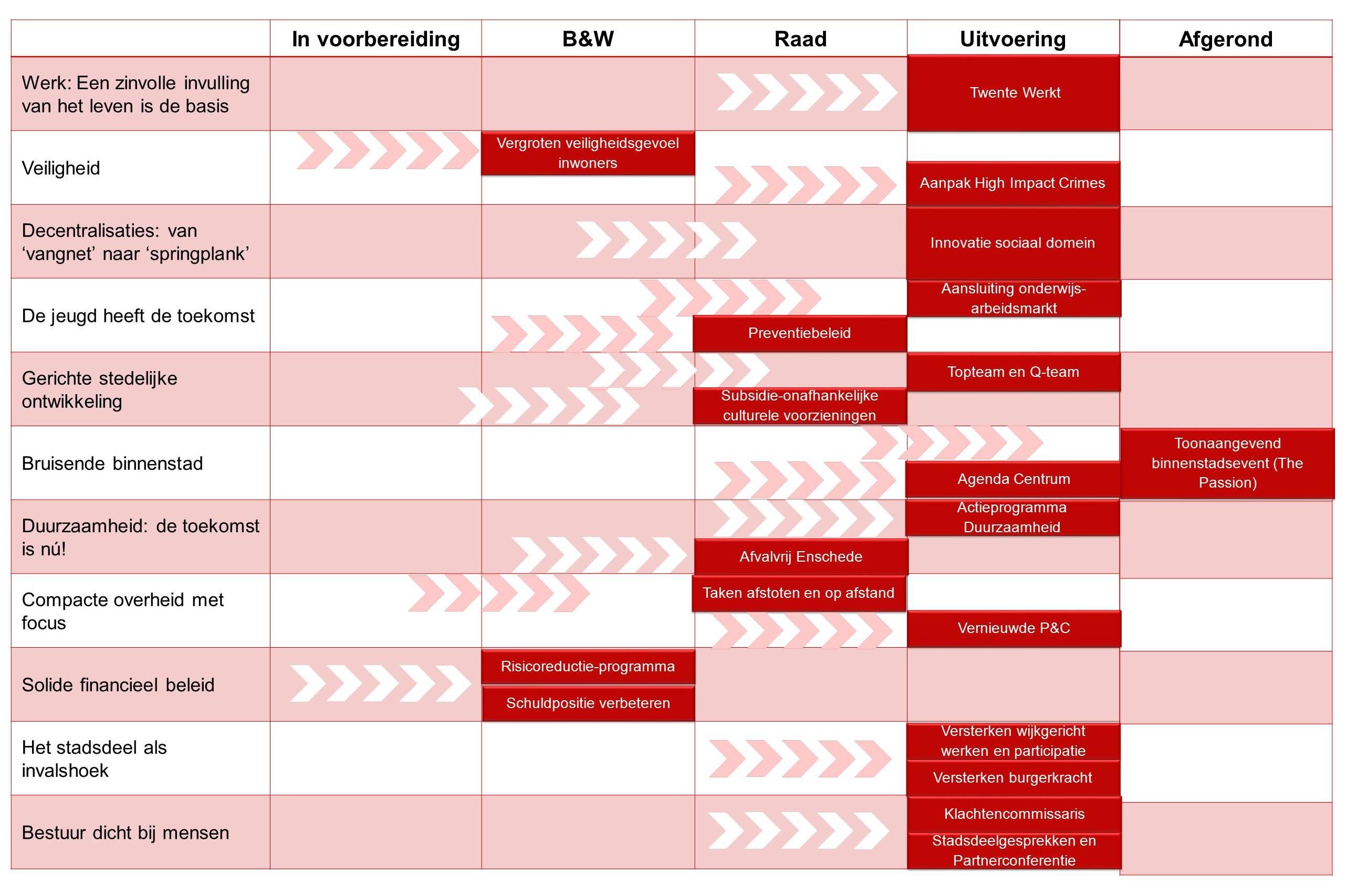 Ten opzichte van de programmabegroting 2015 zijn de meeste thema’s verschoven van ‘in voorbereiding’ naar ‘in uitvoering’. Omdat steeds meer prioriteiten ‘in uitvoering’ zijn, geeft dit ruimte om weer aan ‘nieuwe’ onderwerpen te beginnen. Die gaan we benoemen in de Zomernota 2016. In die Zomernota zullen dus nieuwe onderwerpen aan dit schema worden toegevoegd.